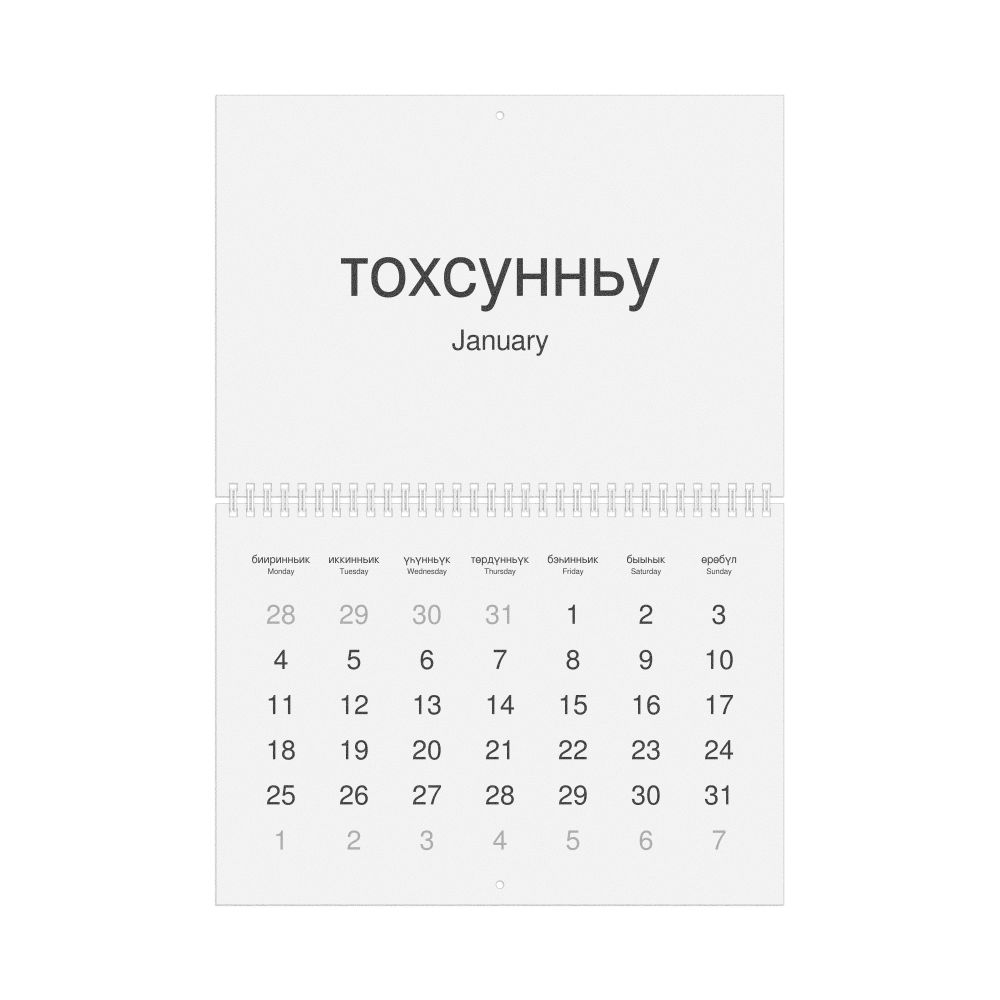 A Yakut-language wall calendar (2027, Monday-start format) with English translations.