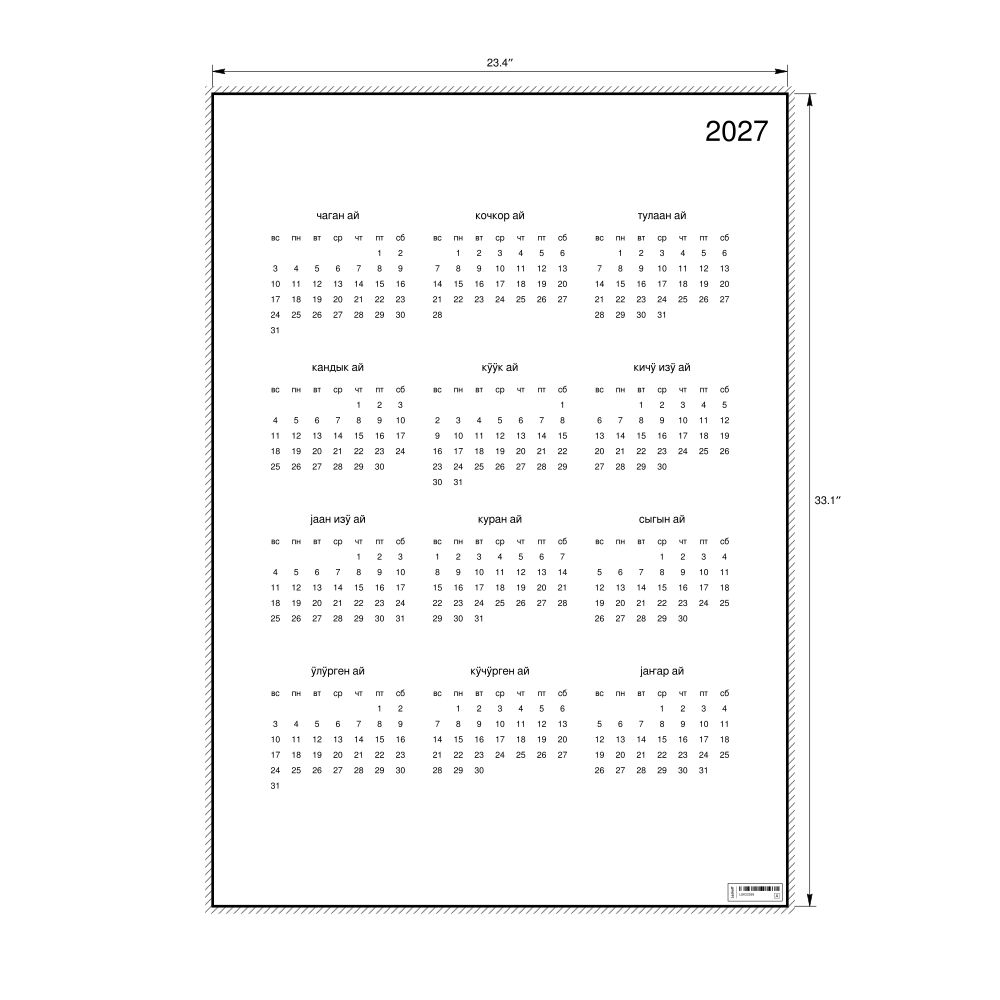 A 2027 wall calendar in Altai. The calendar uses the Sunday-start week format (common in the US and Canada).