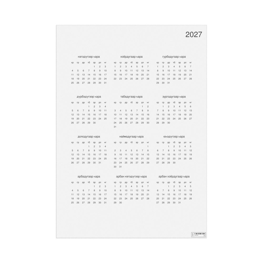A 2027 wall calendar in Buryat. The calendar uses the Monday-start week format (common in the UK and Europe).