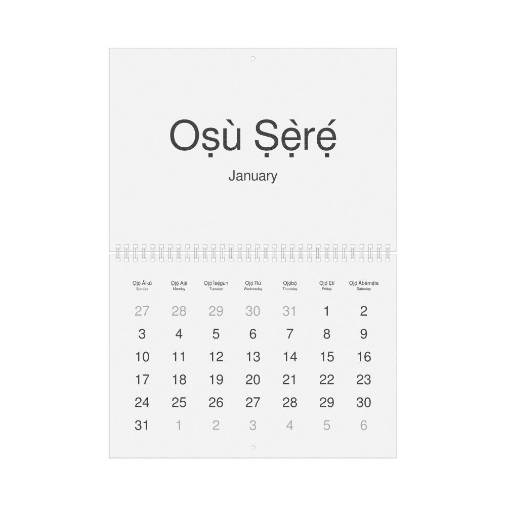 2027 Wall Calendar, Yoruba-Labeled, Sunday-Start Layout, Poster / Wall Print, 23.4 x 33.1 in (59.4 x 84.1 cm)