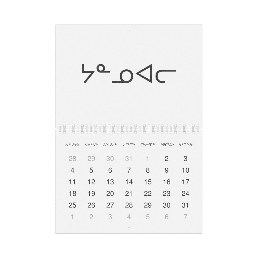 This calendar features the Inuktitut names of months and days of the week on top of a standard Gregorian calendar layout. Beyond its utility for tracking dates, it serves as an educational tool, cultural touchstone (cultural artifact), and functional decor (aesthetic object).