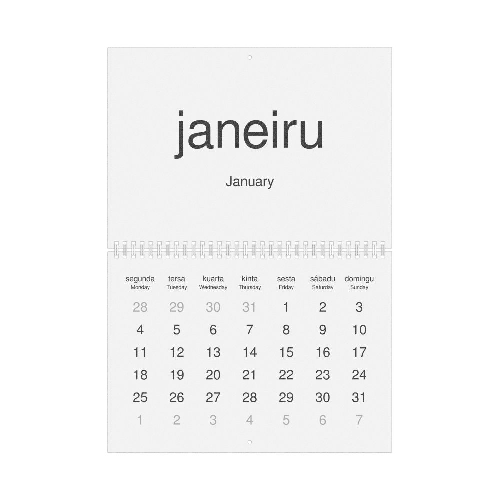 A Tetum-language wall calendar (2027, Monday-start format) with English translations.
