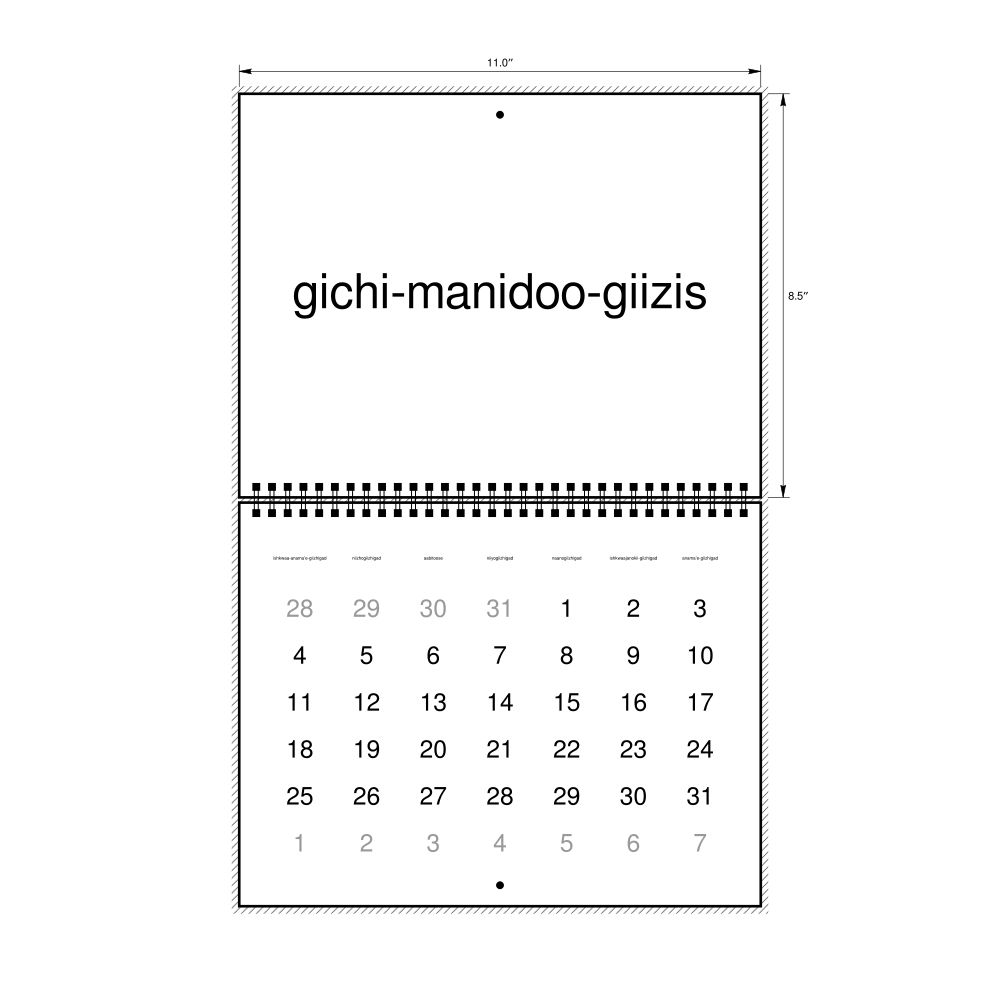 This calendar features the Ojibwe names of months and days of the week on top of a standard Gregorian calendar layout. Beyond its utility for tracking dates, it serves as an educational tool, cultural touchstone (cultural artifact), and functional decor (aesthetic object).