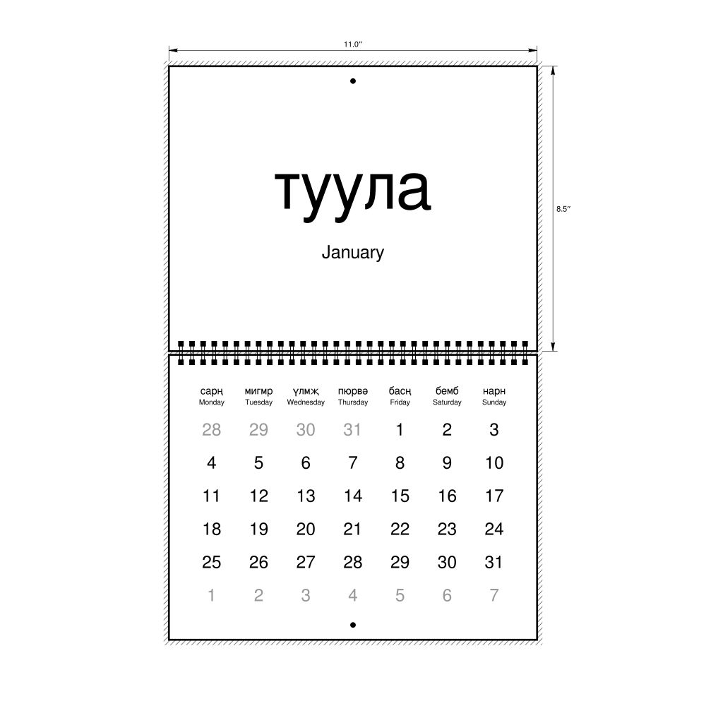 2027 Wall CalendarKalmyk/English-Labeled, Monday-Start Layout, Wire-Bound, 11 x 8.5 in (27.9 x 21.6 cm)