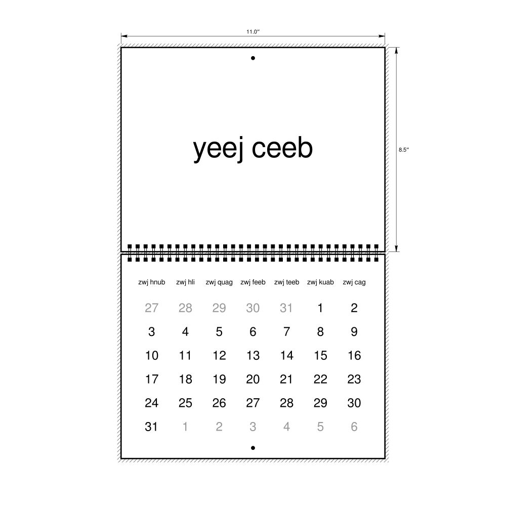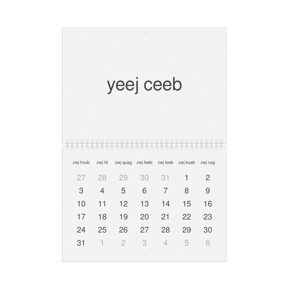This calendar features the Hmong names of months and days of the week on top of a standard Gregorian calendar layout. Beyond its utility for tracking dates, it serves as an educational tool, cultural touchstone (cultural artifact), and functional decor (aesthetic object).