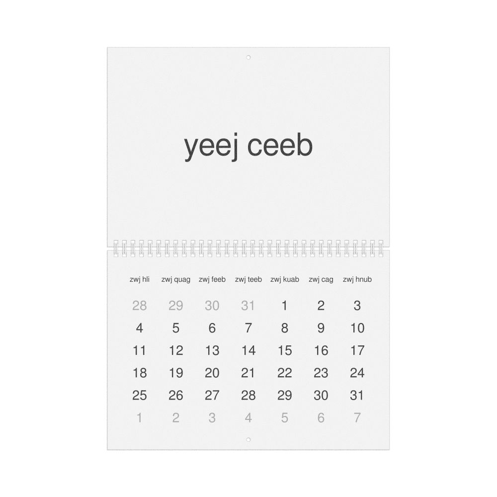This calendar features the Hmong names of months and days of the week on top of a standard Gregorian calendar layout. Beyond its utility for tracking dates, it serves as an educational tool, cultural touchstone (cultural artifact), and functional decor (aesthetic object).