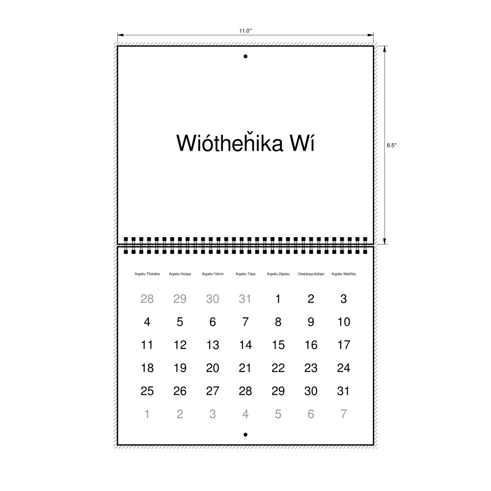 This calendar features the Lakota names of months and days of the week on top of a standard Gregorian calendar layout. Beyond its utility for tracking dates, it serves as an educational tool, cultural touchstone (cultural artifact), and functional decor (aesthetic object).
