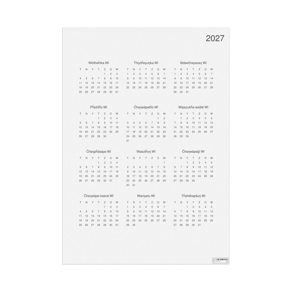 - Linguistics enthusiasts and polyglots - For "language geeks" interested in comparative linguistics or the mechanics of different languages and who value the aesthetic differences in scripts, orthography, and typography of different languages, the Lakota calendar serves as an object of intellectual interest. You can collect calendars for various languages to compare their linguistic roots (e.g., comparing Romance languages vs. Slavic languages). Leskoff's calendars are characterized by specific typographic choices that highlight the orthography and script unique to the target language. Think correct usage of diacritics, characters, and directional writing (left-to-right vs. right-to-left). The minimalist design focuses on legibility and aesthetic appeal of the script itself.