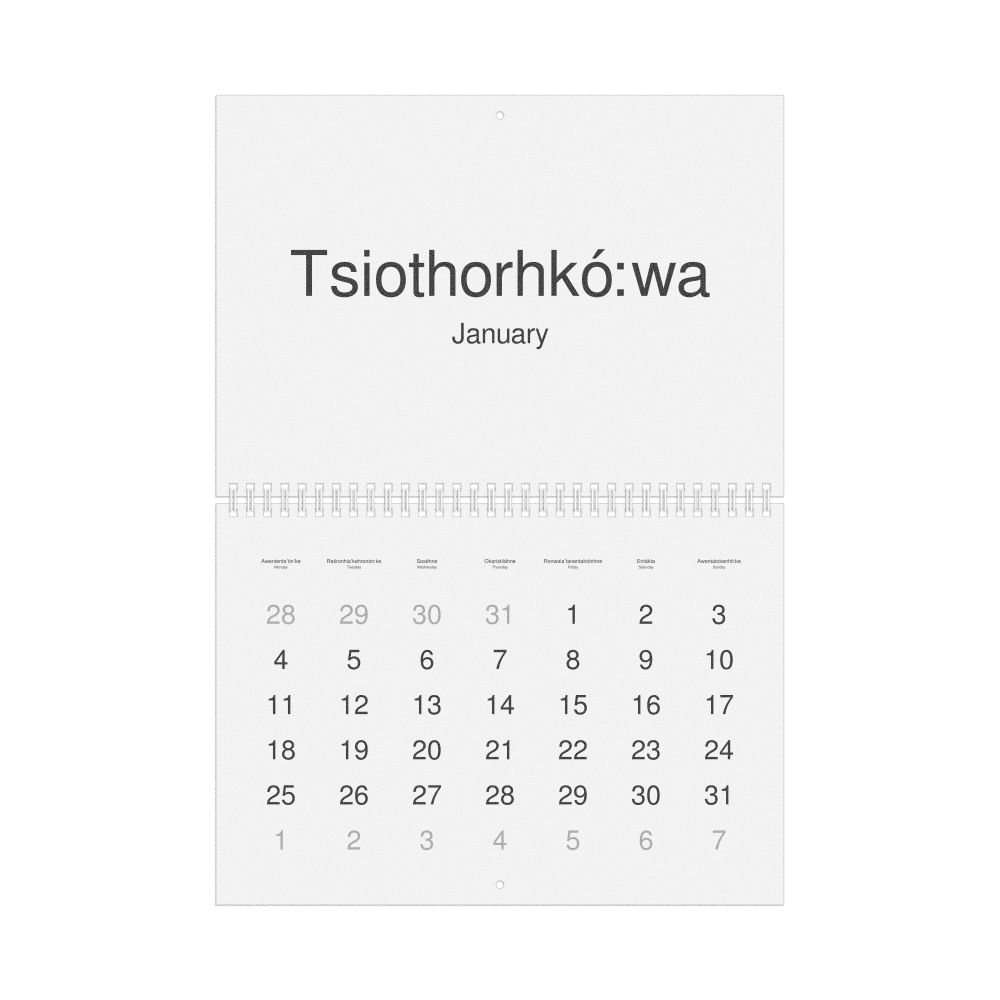 A Mohawk-language wall calendar (2027, Monday-start format) with English translations.