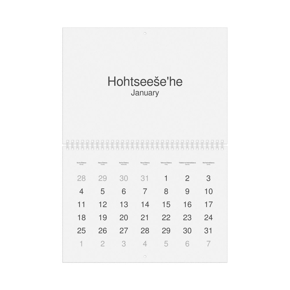 A Cheyenne-language wall calendar (2027, Monday-start format) with English translations.