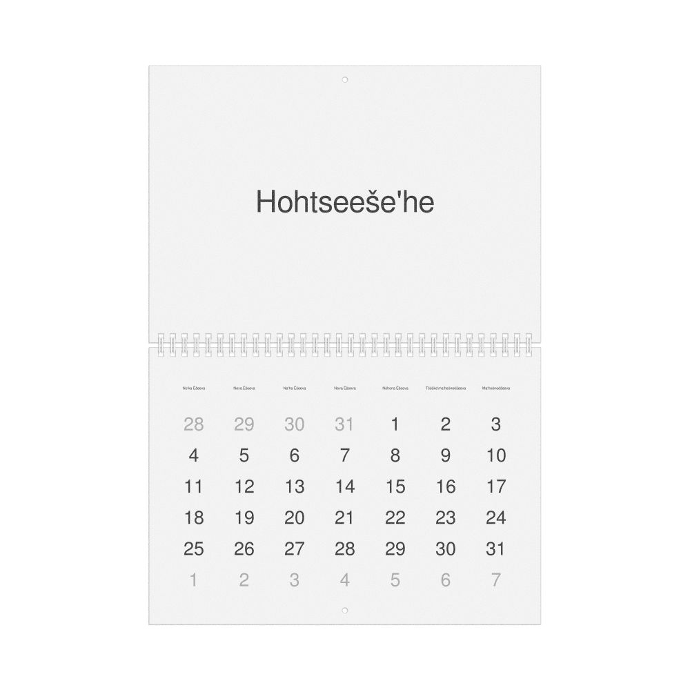 This calendar features the Cheyenne names of months and days of the week on top of a standard Gregorian calendar layout. Beyond its utility for tracking dates, it serves as an educational tool, cultural touchstone (cultural artifact), and functional decor (aesthetic object).