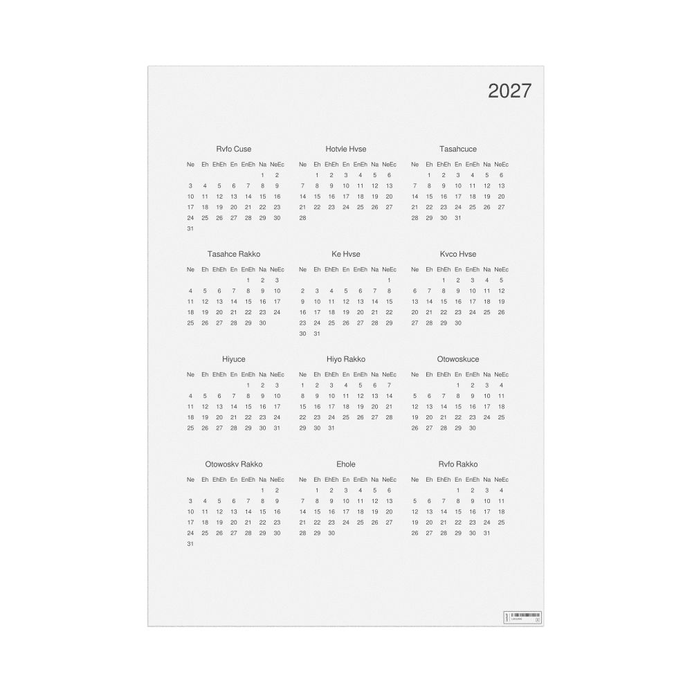 - Linguistics enthusiasts and polyglots - For "language geeks" interested in comparative linguistics or the mechanics of different languages and who value the aesthetic differences in scripts, orthography, and typography of different languages, the Muscogee calendar serves as an object of intellectual interest. You can collect calendars for various languages to compare their linguistic roots (e.g., comparing Romance languages vs. Slavic languages). Leskoff's calendars are characterized by specific typographic choices that highlight the orthography and script unique to the target language. Think correct usage of diacritics, characters, and directional writing (left-to-right vs. right-to-left). The minimalist design focuses on legibility and aesthetic appeal of the script itself.