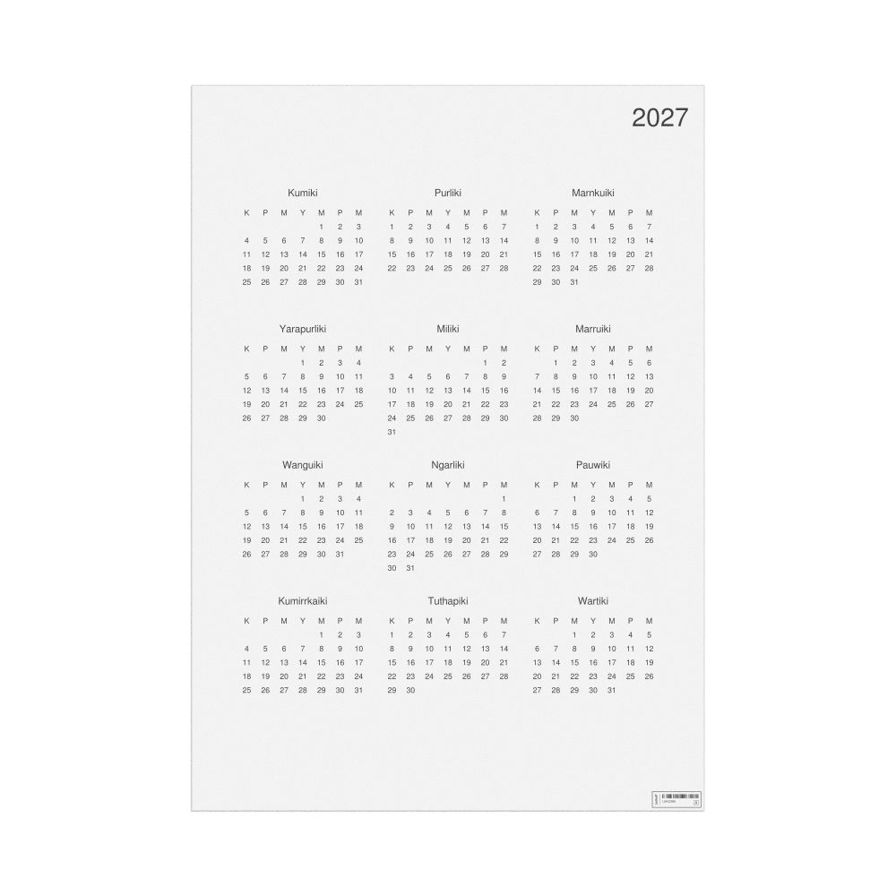 A 2027 wall calendar in Kaurna. The calendar uses the Monday-start week format (common in the UK and Europe).