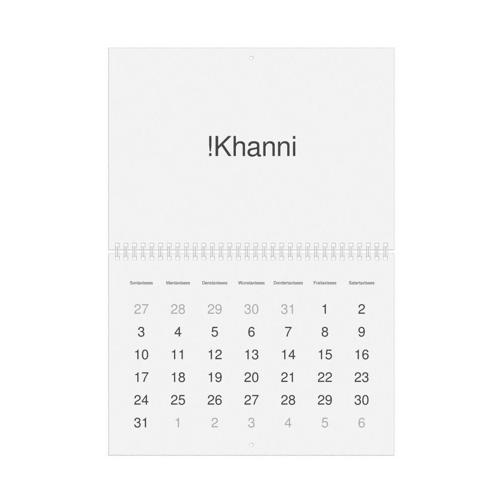 This calendar features the Khoekhoe names of months and days of the week on top of a standard Gregorian calendar layout. Beyond its utility for tracking dates, it serves as an educational tool, cultural touchstone (cultural artifact), and functional decor (aesthetic object).