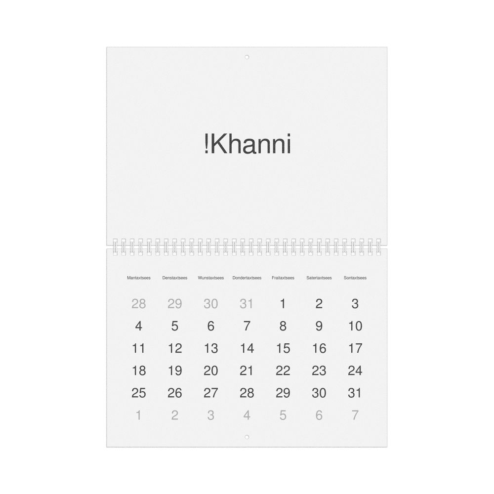 This calendar features the Khoekhoe names of months and days of the week on top of a standard Gregorian calendar layout. Beyond its utility for tracking dates, it serves as an educational tool, cultural touchstone (cultural artifact), and functional decor (aesthetic object).