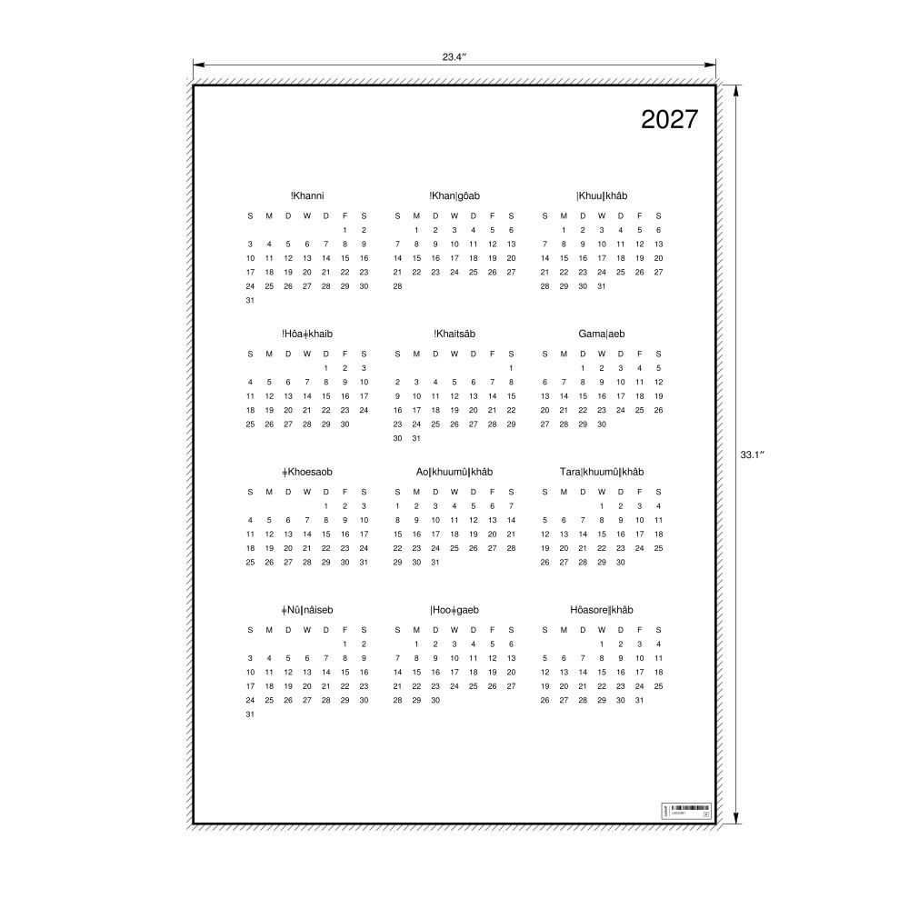 A 2027 wall calendar in Khoekhoe. The calendar uses the Sunday-start week format (common in the US and Canada).