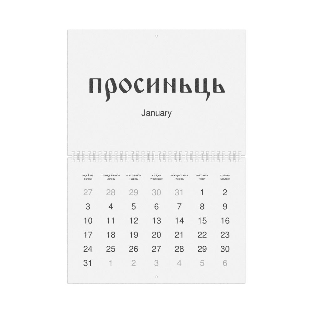 This calendar features the names of months and days of the week in Old Church Slavonic on top of a modern, standard Gregorian calendar layout. Beyond its utility for tracking dates, it serves as an educational tool and functional decor (aesthetic object).