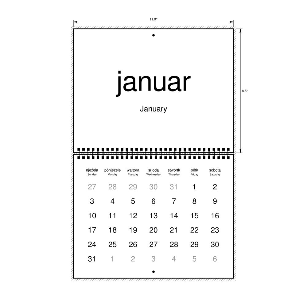 2027 Wall CalendarLower Sorbian/English-Labeled, Sunday-Start Layout, Wire-Bound, 11 x 8.5 in (27.9 x 21.6 cm)