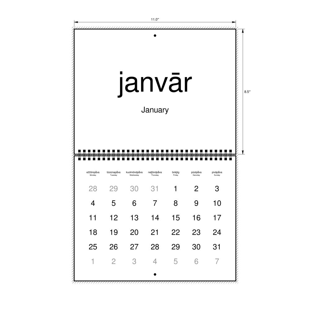 2027 Wall CalendarLivonian/English-Labeled, Monday-Start Layout, Wire-Bound, 11 x 8.5 in (27.9 x 21.6 cm)