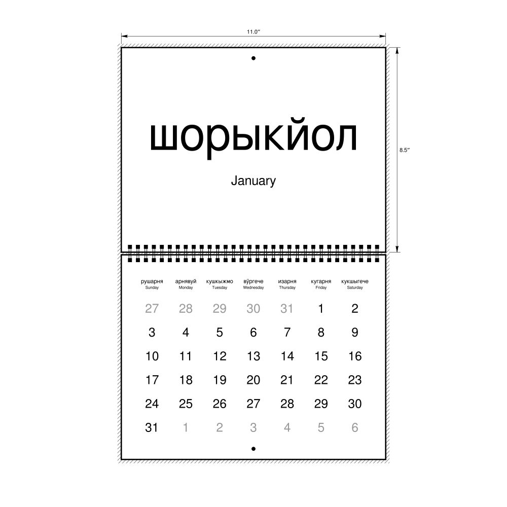 2026 Wall Calendar, Meadow Mari/English-Labeled, Sunday-Start Layout, Wire-Bound, 11 x 8.5 in (27.9 x 21.6 cm)