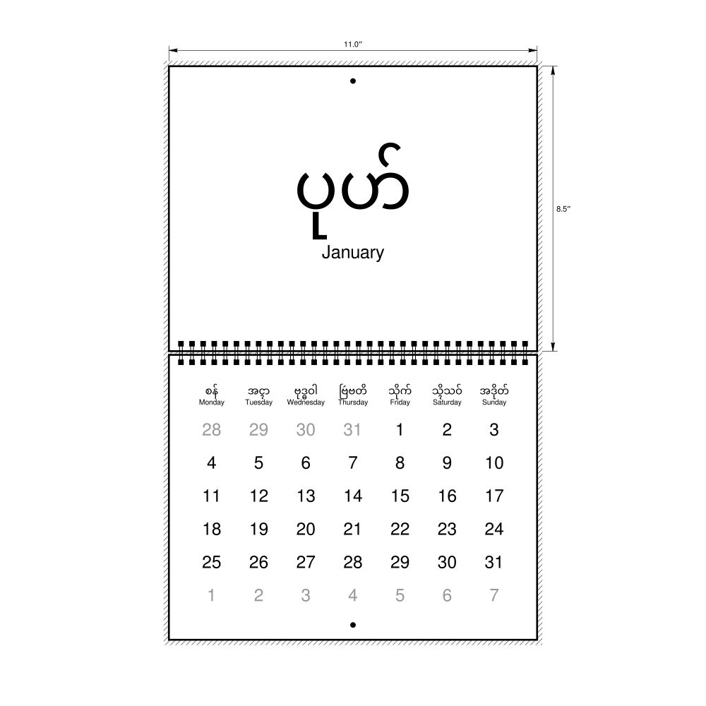 A Mon-language wall calendar (2027, Monday-start format) with English translations.