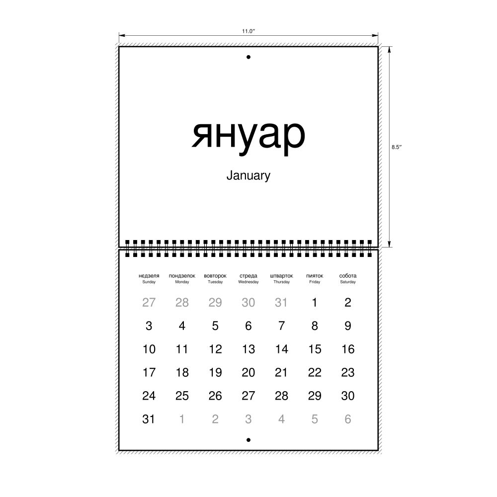 2027 Wall CalendarPannonian Rusyn/English-Labeled, Sunday-Start Layout, Wire-Bound, 11 x 8.5 in (27.9 x 21.6 cm)