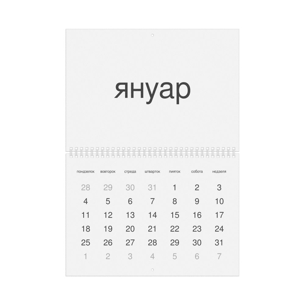 - Linguistics enthusiasts and polyglots - For "language geeks" interested in comparative linguistics or the mechanics of different languages and who value the aesthetic differences in scripts, orthography, and typography of different languages, the Pannonian Rusyn calendar serves as an object of intellectual interest. You can collect calendars for various languages to compare their linguistic roots (e.g., comparing Romance languages vs. Slavic languages). Leskoff's calendars are characterized by specific typographic choices that highlight the orthography and script unique to the target language. Think correct usage of diacritics, characters, and directional writing (left-to-right vs. right-to-left). The minimalist design focuses on legibility and aesthetic appeal of the script itself.