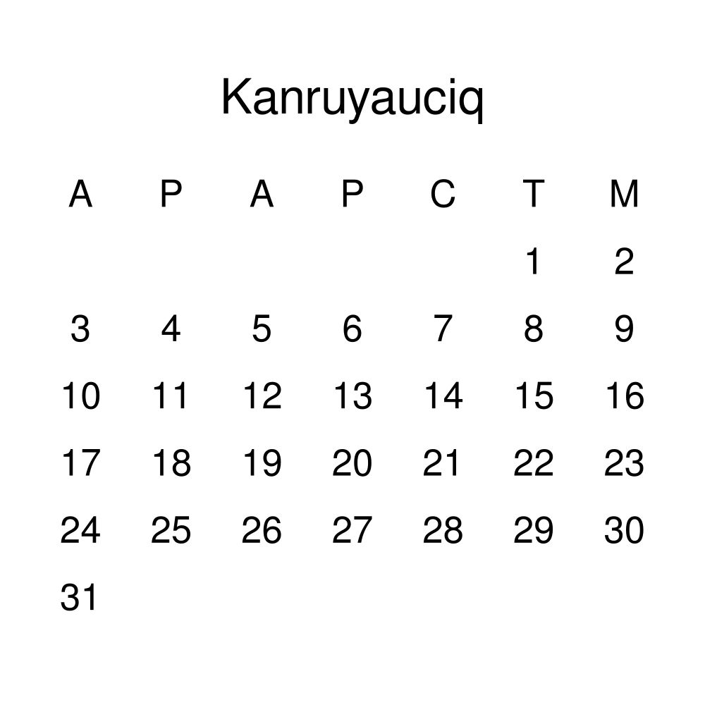 This calendar features the Yup'ik names of months and days of the week on top of a standard Gregorian calendar layout. Beyond its utility for tracking dates, it serves as an educational tool, cultural touchstone (cultural artifact), and functional decor (aesthetic object).
