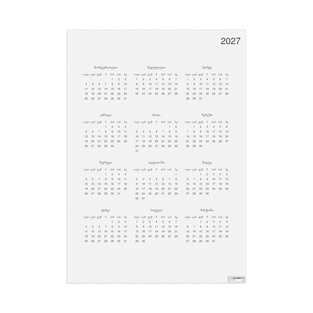 - Linguistics enthusiasts and polyglots - For "language geeks" interested in comparative linguistics or the mechanics of different languages and who value the aesthetic differences in scripts, orthography, and typography of different languages, the Laz calendar serves as an object of intellectual interest. You can collect calendars for various languages to compare their linguistic roots (e.g., comparing Romance languages vs. Slavic languages). Leskoff's calendars are characterized by specific typographic choices that highlight the orthography and script unique to the target language. Think correct usage of diacritics, characters, and directional writing (left-to-right vs. right-to-left). The minimalist design focuses on legibility and aesthetic appeal of the script itself.