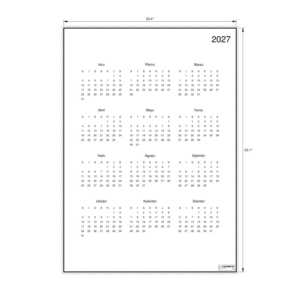 2027 Wall Calendar, Maguindanao-Labeled, Sunday-Start Layout, Poster / Wall Print, 23.4 x 33.1 in (59.4 x 84.1 cm)