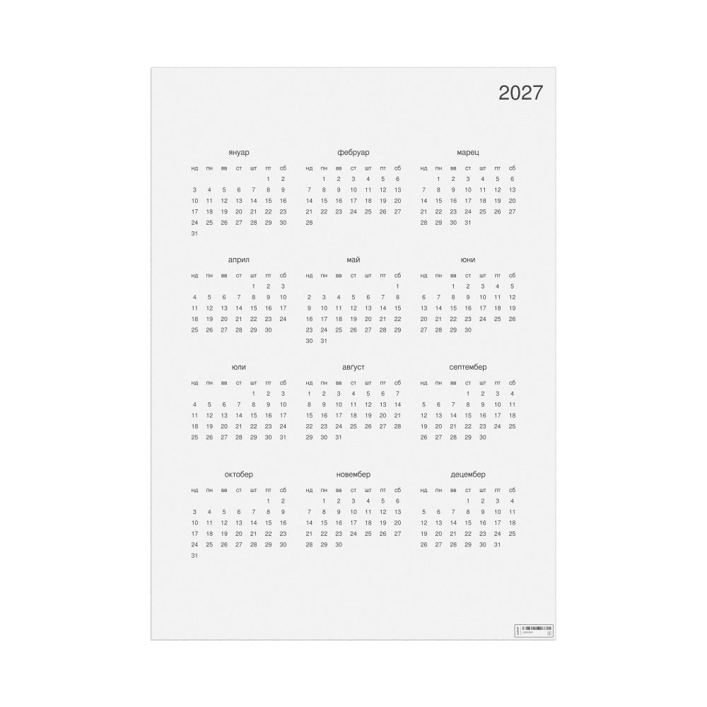 A 2027 wall calendar in Pannonian Rusyn. The calendar uses the Sunday-start week format (common in the US and Canada).