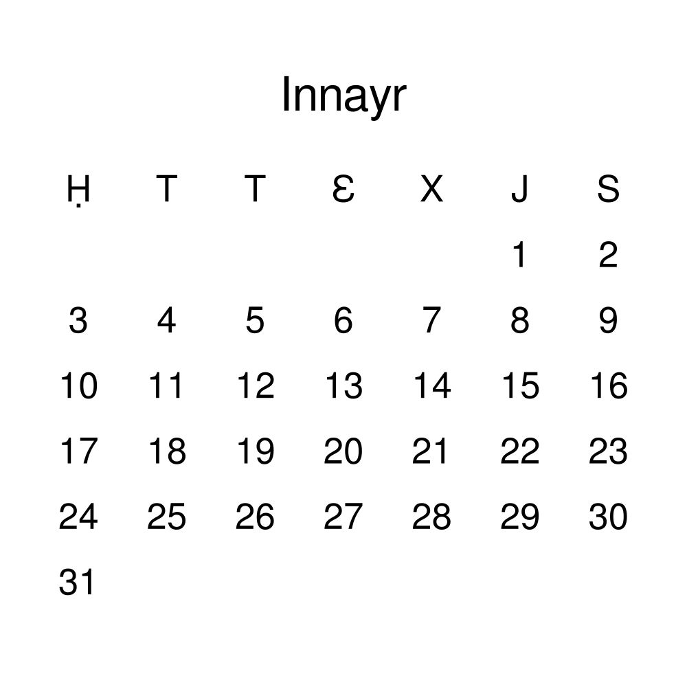 This calendar features the Tashelhit names of months and days of the week on top of a standard Gregorian calendar layout. Beyond its utility for tracking dates, it serves as an educational tool, cultural touchstone (cultural artifact), and functional decor (aesthetic object).