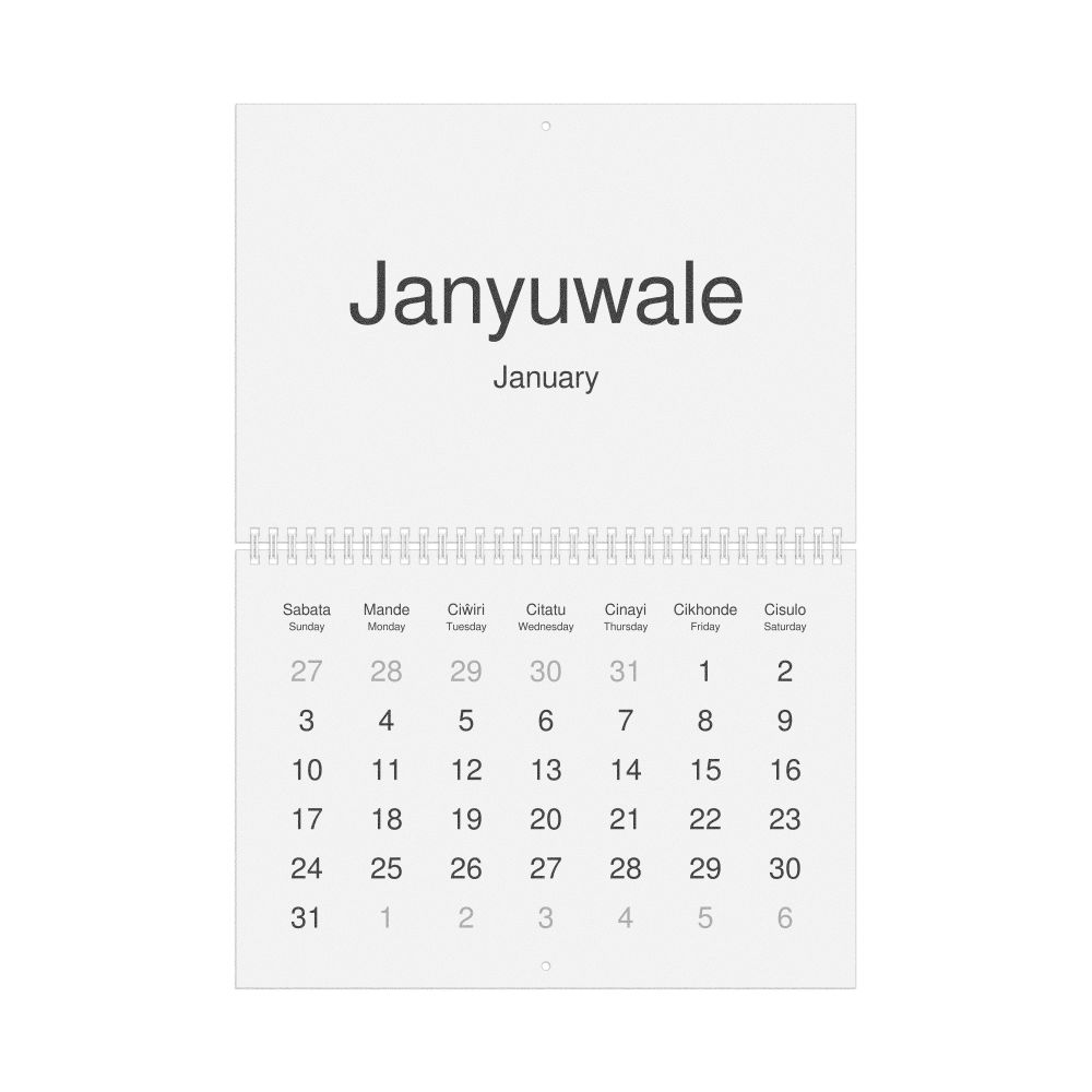 2026 Wall Calendar, Tumbuka/English-Labeled, Sunday-Start Layout, Wire-Bound, 11.7 x 8.3 in (29.7 x 21.0 cm)