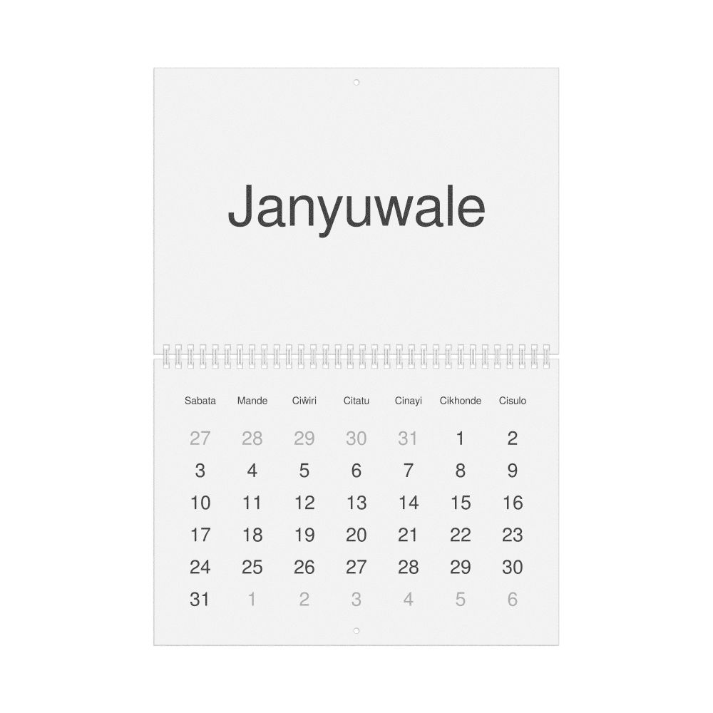 This calendar features the Tumbuka names of months and days of the week on top of a standard Gregorian calendar layout. Beyond its utility for tracking dates, it serves as an educational tool, cultural touchstone (cultural artifact), and functional decor (aesthetic object).