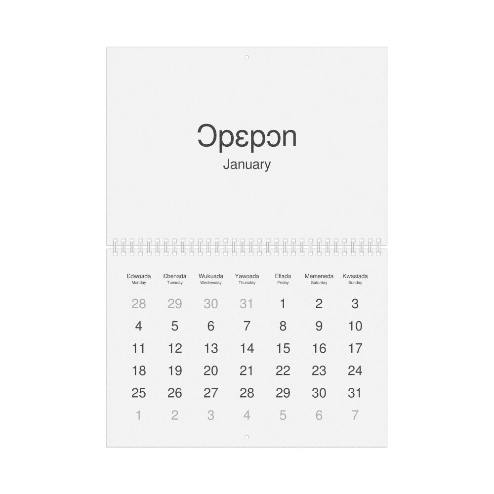 A Twi-language wall calendar (2027, Monday-start format) with English translations.