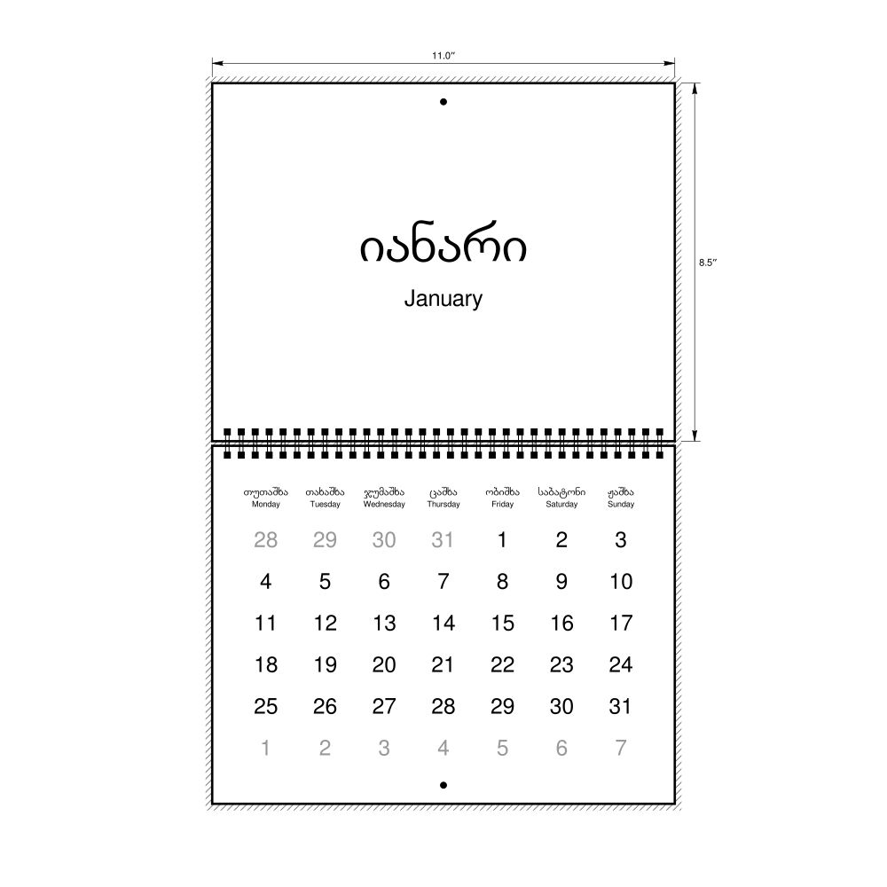 2027 Wall CalendarMingrelian/English-Labeled, Monday-Start Layout, Wire-Bound, 11 x 8.5 in (27.9 x 21.6 cm)