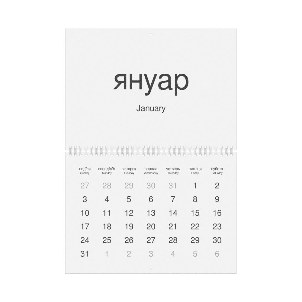 2026 Wall Calendar, Rusyn/English-Labeled, Monday-Start Layout, Wire-Bound, 11.7 x 8.3 in (29.7 x 21.0 cm)