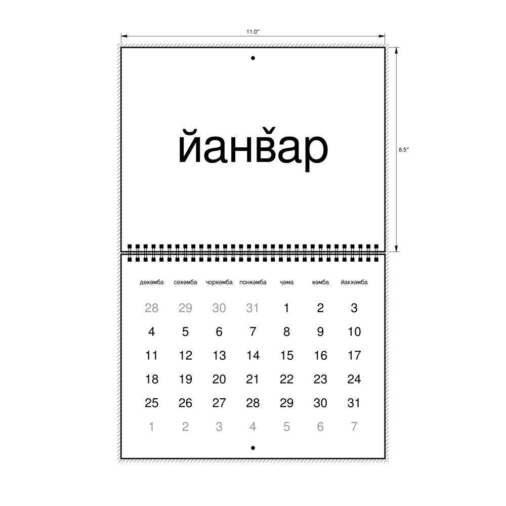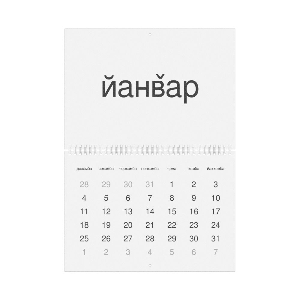 - Linguistics enthusiasts and polyglots - For "language geeks" interested in comparative linguistics or the mechanics of different languages and who value the aesthetic differences in scripts, orthography, and typography of different languages, the Yazghulami calendar serves as an object of intellectual interest. You can collect calendars for various languages to compare their linguistic roots (e.g., comparing Romance languages vs. Slavic languages). Leskoff's calendars are characterized by specific typographic choices that highlight the orthography and script unique to the target language. Think correct usage of diacritics, characters, and directional writing (left-to-right vs. right-to-left). The minimalist design focuses on legibility and aesthetic appeal of the script itself.