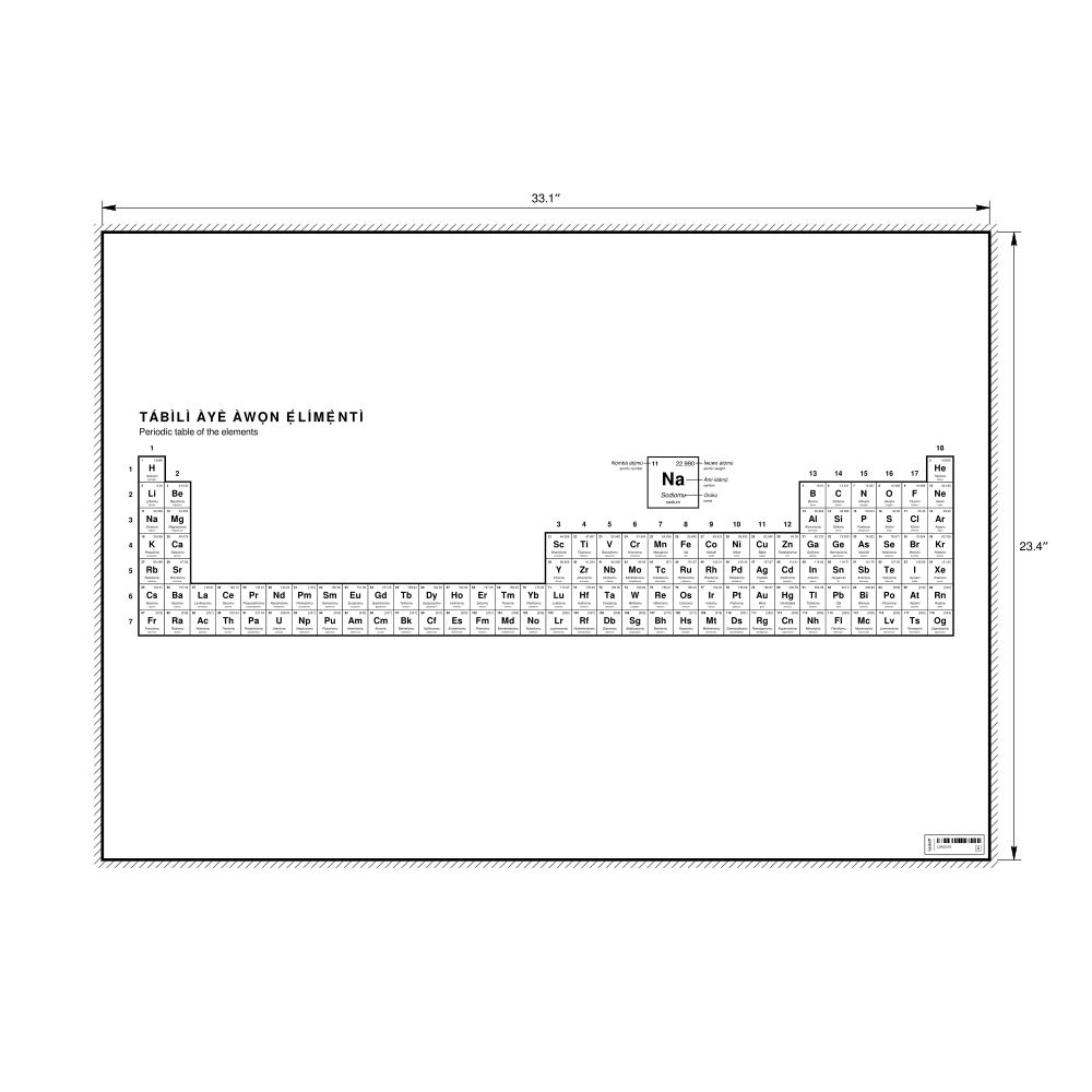 A periodic table chart in Yoruba (Tábìlì àyè àwọn ẹ́límẹ̀ntì) with English translations in the 33.1 x 23.4 in (84.1 x 59.4 cm, poster / wall chart) format. 32-column layout featuring the atomic numbers, atomic weights, symbols, and names of all chemical elements.