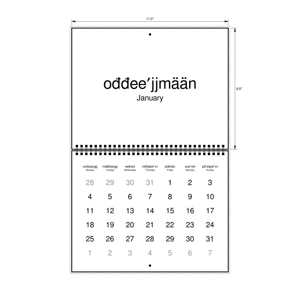 2026 Wall Calendar, Skolt Sámi-Labeled, Monday-Start Layout, Wire-Bound, 11 x 8.5 in (27.9 x 21.6 cm)