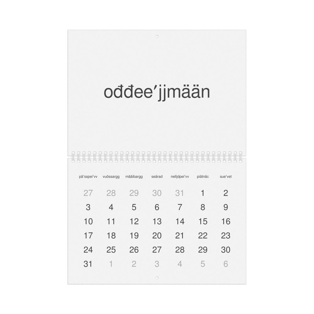 This calendar features the Skolt Sámi names of months and days of the week on top of a standard Gregorian calendar layout. Beyond its utility for tracking dates, it serves as an educational tool, cultural touchstone (cultural artifact), and functional decor (aesthetic object).