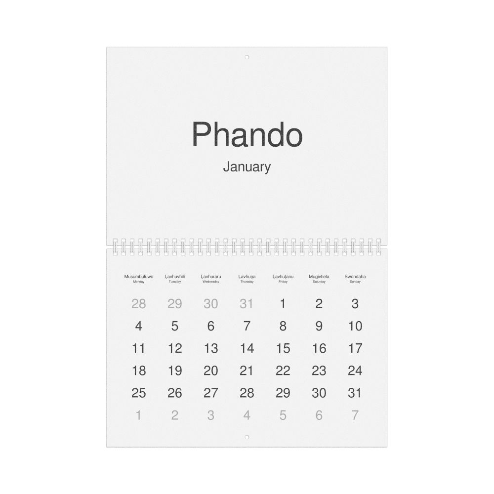 A Venda-language wall calendar (2027, Monday-start format) with English translations.