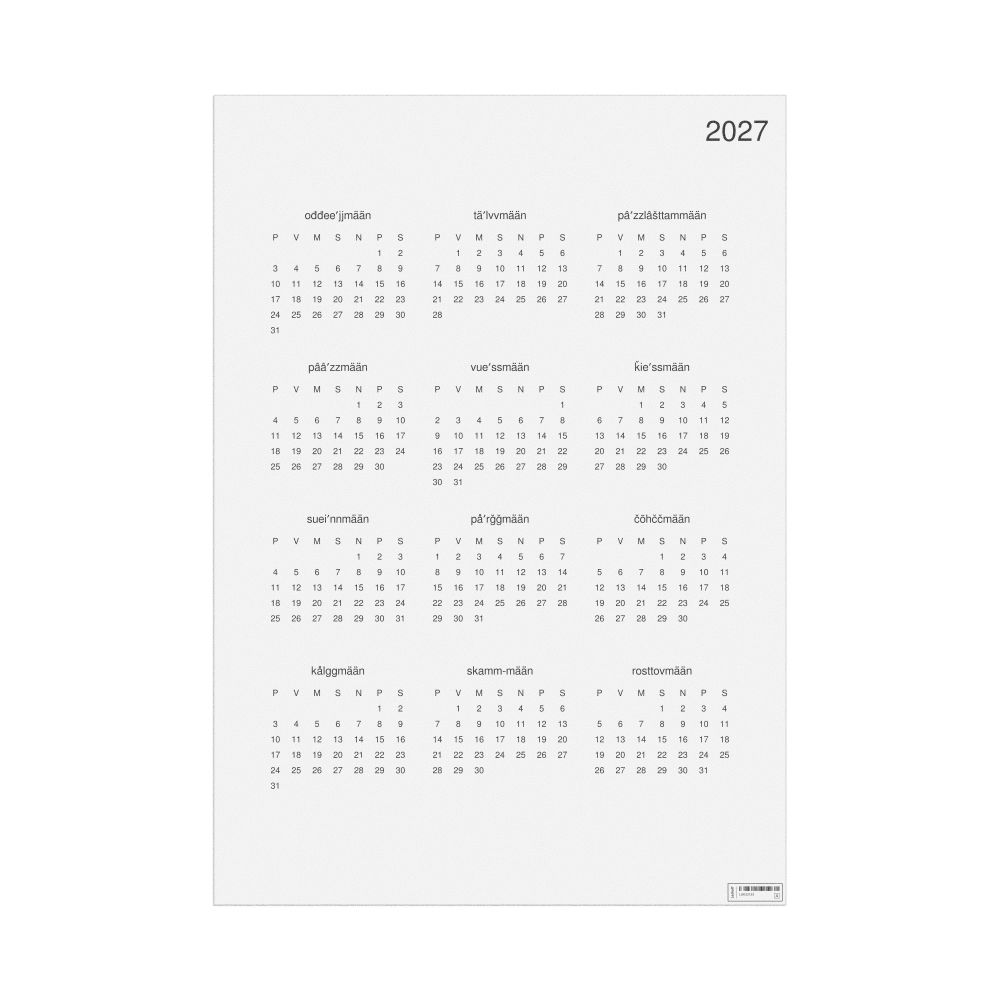 - Linguistics enthusiasts and polyglots - For "language geeks" interested in comparative linguistics or the mechanics of different languages and who value the aesthetic differences in scripts, orthography, and typography of different languages, the Skolt Sámi calendar serves as an object of intellectual interest. You can collect calendars for various languages to compare their linguistic roots (e.g., comparing Romance languages vs. Slavic languages). Leskoff's calendars are characterized by specific typographic choices that highlight the orthography and script unique to the target language. Think correct usage of diacritics, characters, and directional writing (left-to-right vs. right-to-left). The minimalist design focuses on legibility and aesthetic appeal of the script itself.
