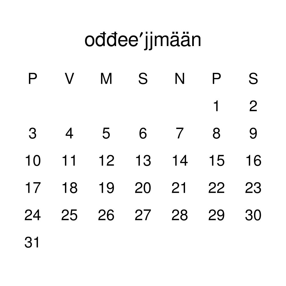 This calendar features the Skolt Sámi names of months and days of the week on top of a standard Gregorian calendar layout. Beyond its utility for tracking dates, it serves as an educational tool, cultural touchstone (cultural artifact), and functional decor (aesthetic object).