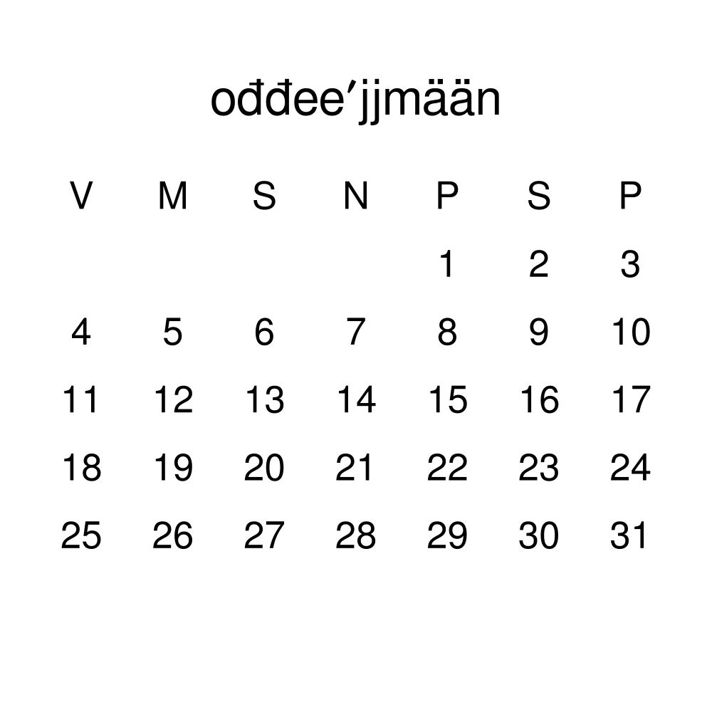 • Skolt Sámi speakers and enthusiasts - Choose this calendar if you are looking for a simple, localized calendar in the Skolt Sámi language. Use it in your home, office, or classroom as a regular calendar.