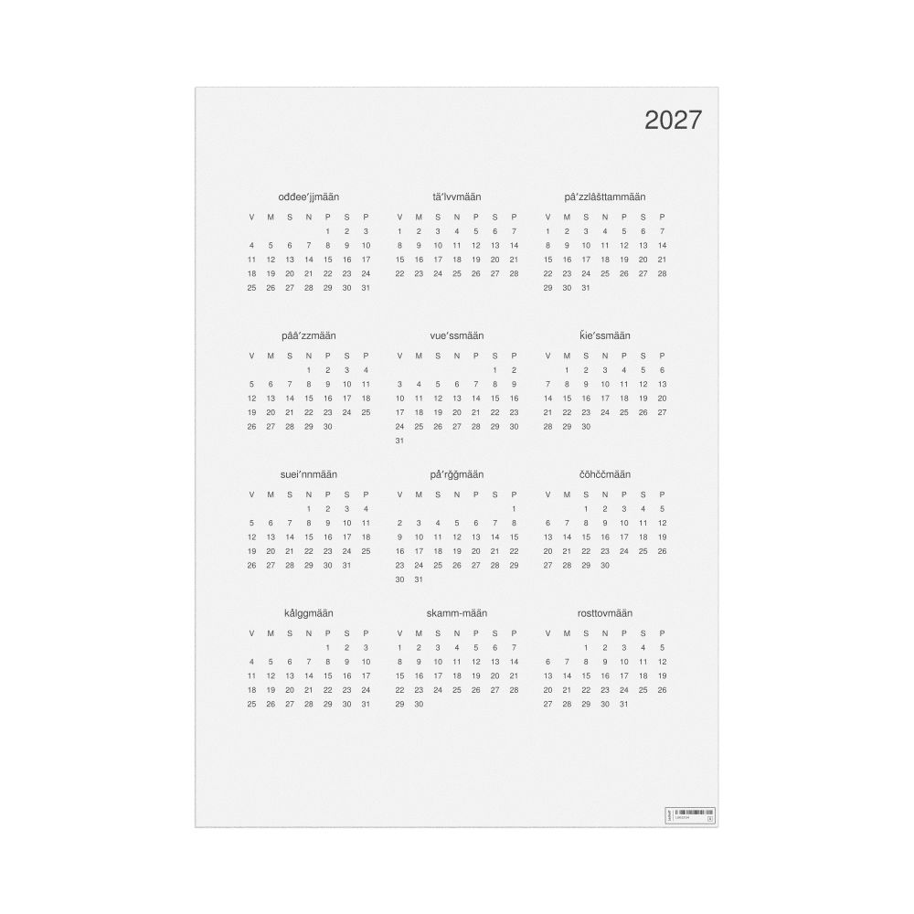 A 2027 wall calendar in Skolt Sámi. The calendar uses the Monday-start week format (common in the UK and Europe).