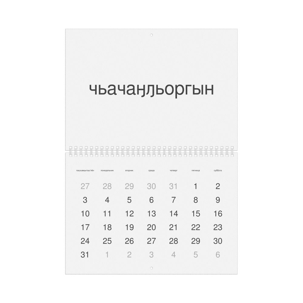 This calendar features the Chukchi names of months and days of the week on top of a standard Gregorian calendar layout. Beyond its utility for tracking dates, it serves as an educational tool, cultural touchstone (cultural artifact), and functional decor (aesthetic object).