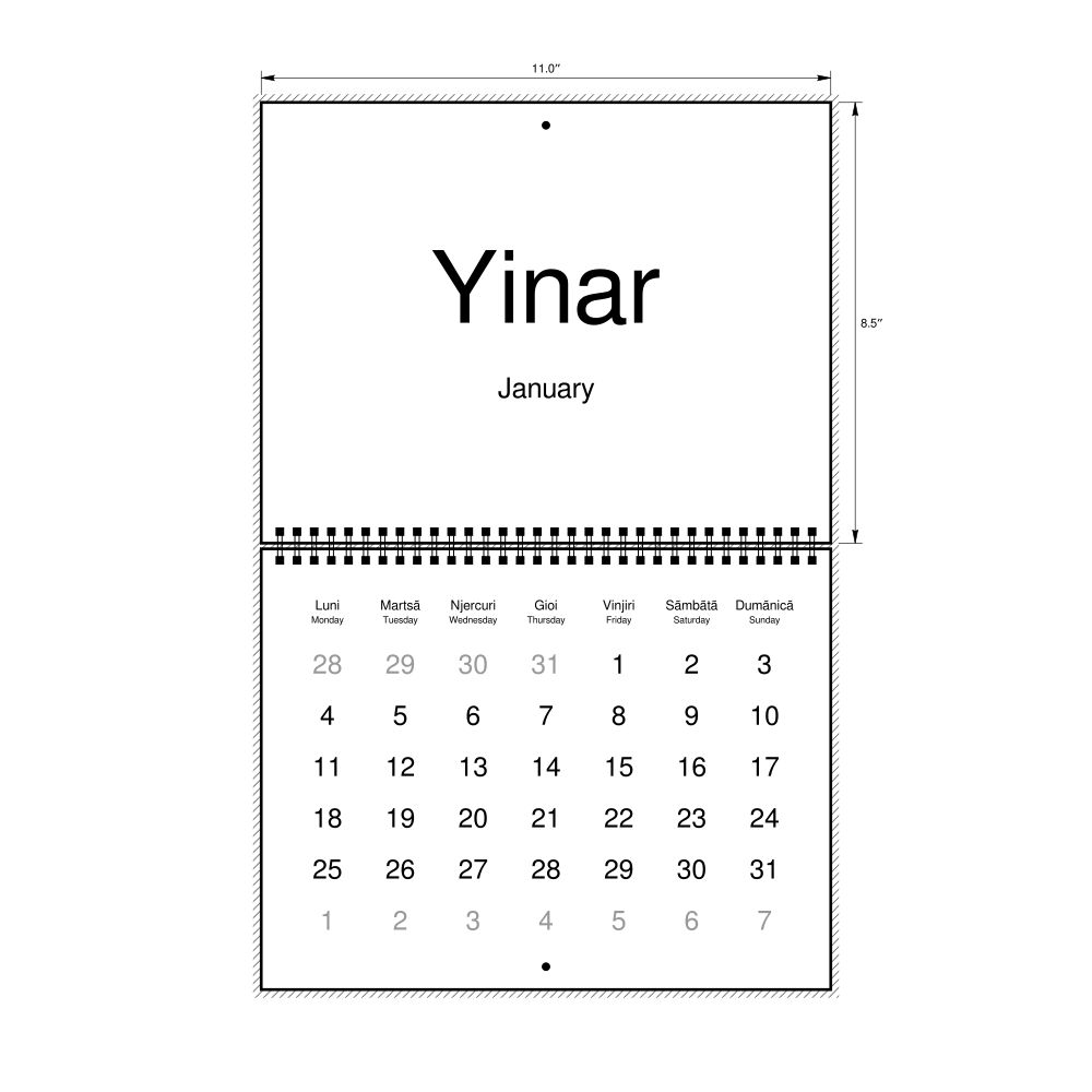 2027 Wall CalendarAromanian/English-Labeled, Monday-Start Layout, Wire-Bound, 11 x 8.5 in (27.9 x 21.6 cm)