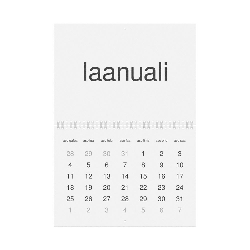 This calendar features the Tuvaluan names of months and days of the week on top of a standard Gregorian calendar layout. Beyond its utility for tracking dates, it serves as an educational tool, cultural touchstone (cultural artifact), and functional decor (aesthetic object).