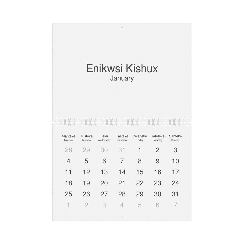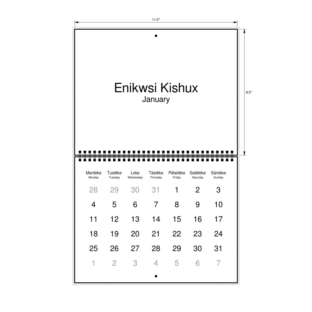 An Unami-language wall calendar (2027, Monday-start format) with English translations.